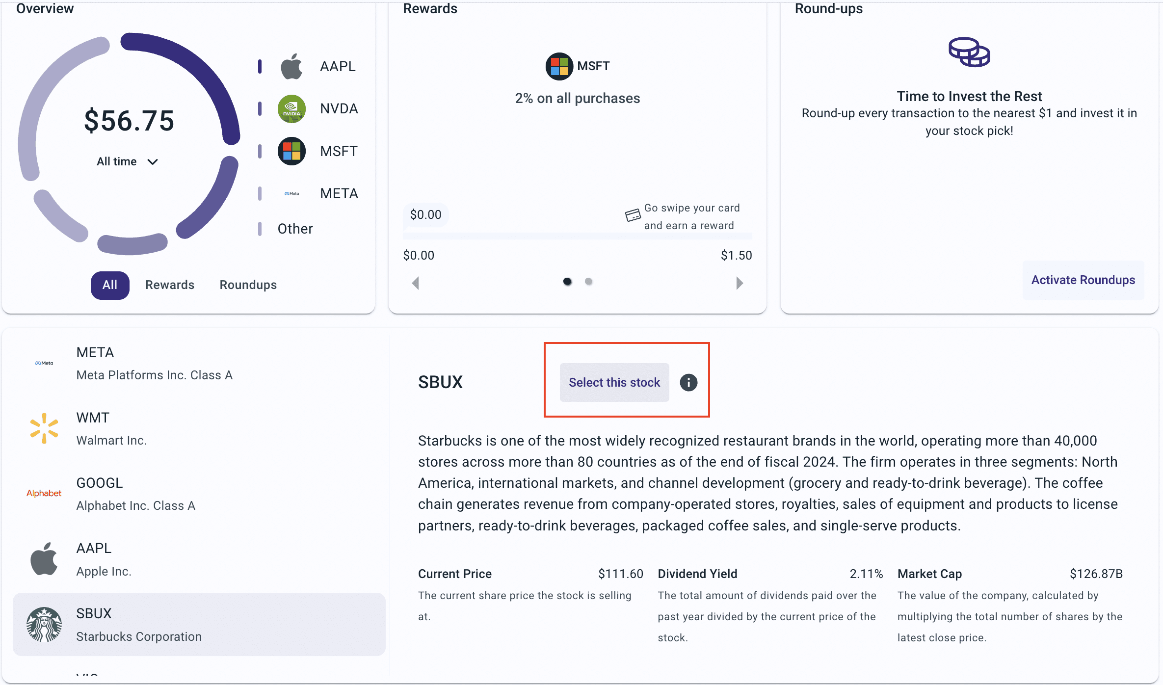 From this point forward, every transaction made using your associated card or checking account will yield a displayed return in the form of the selected stock. In this case, 2% will be yielded in returns from the Starbucks stock we have selected. You can also now track the rewards you collect with Starbucks stock, with every card swipe you make.