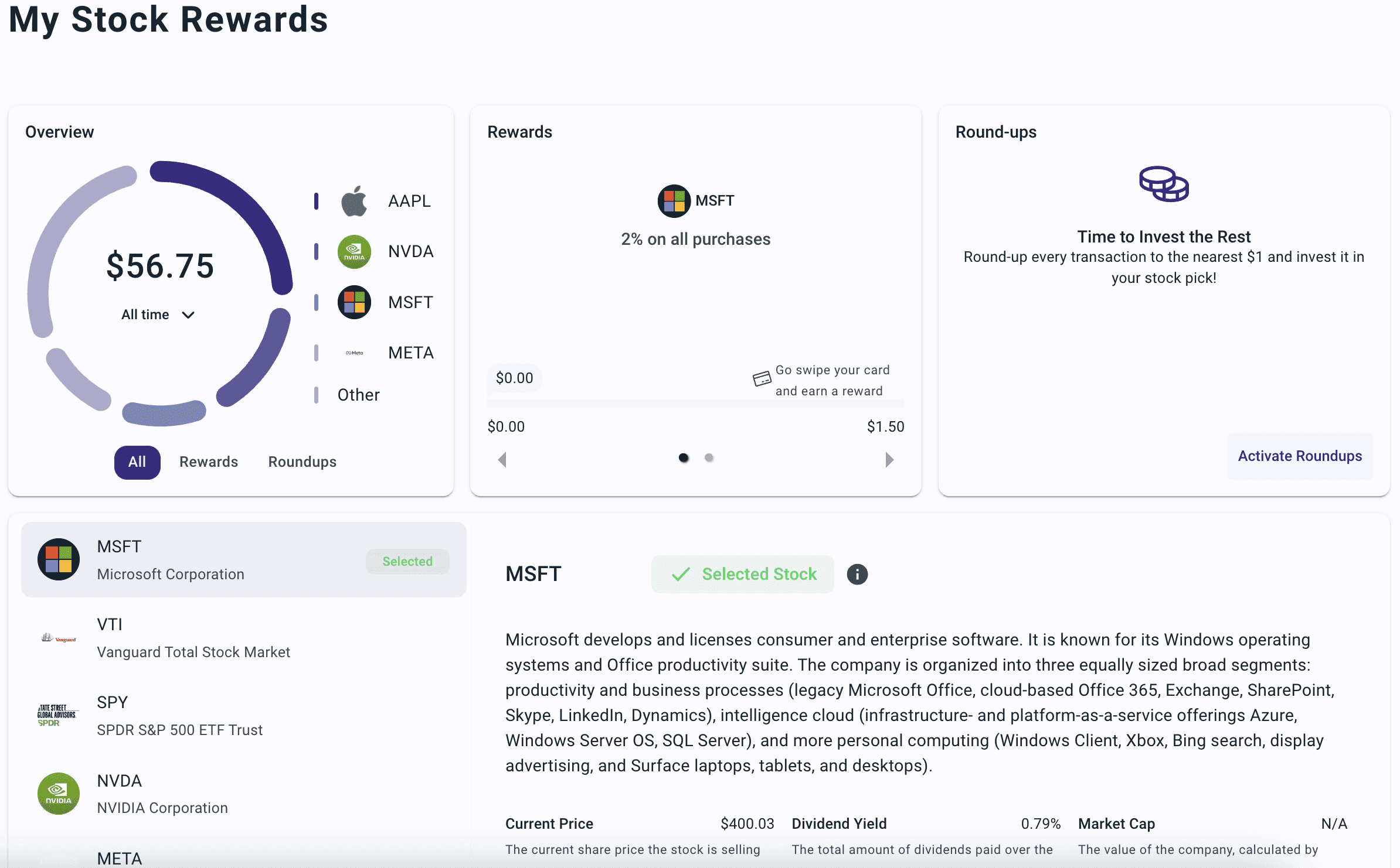 Begin from the rewards module, where your current stock selection is visible. In this example, Microsoft stock is the current selection.
