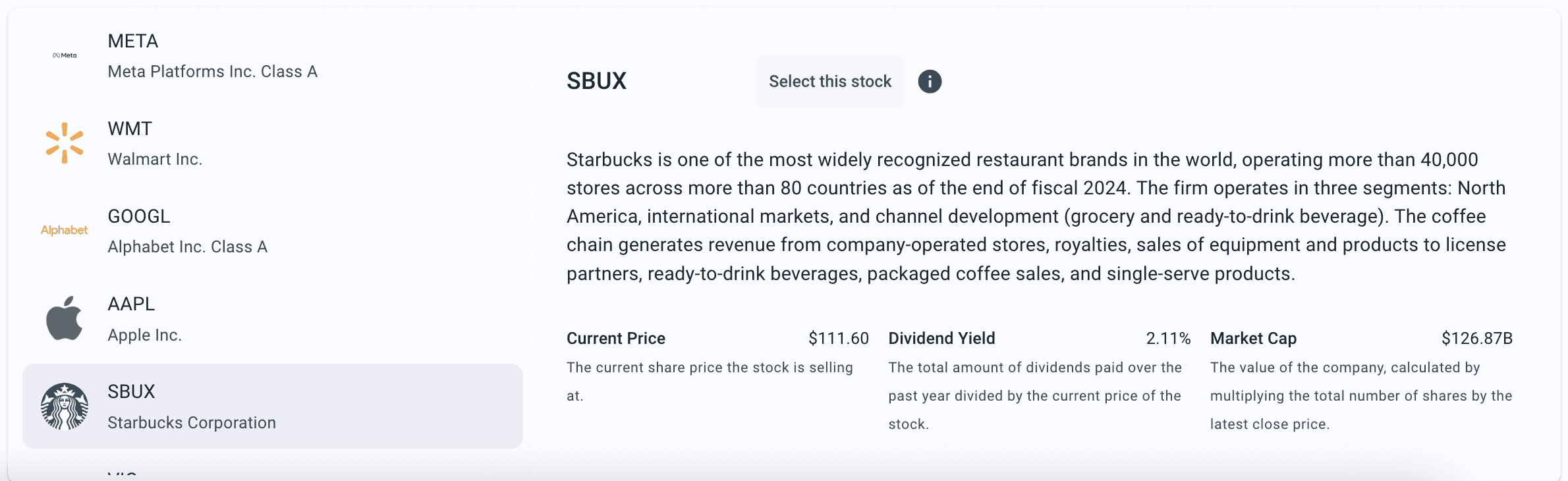 You can choose from a list of preselected stocks, which vary for each financial institution. Chose your desired stock to change the current stock pick. In our tutorial, we are selecting Starbucks as our desired stock pick.