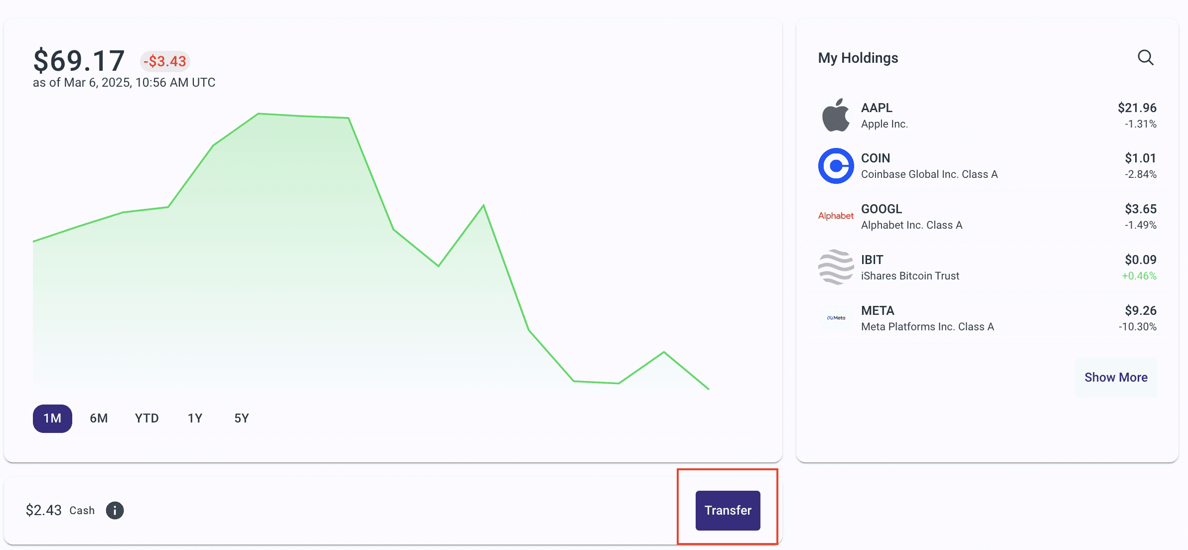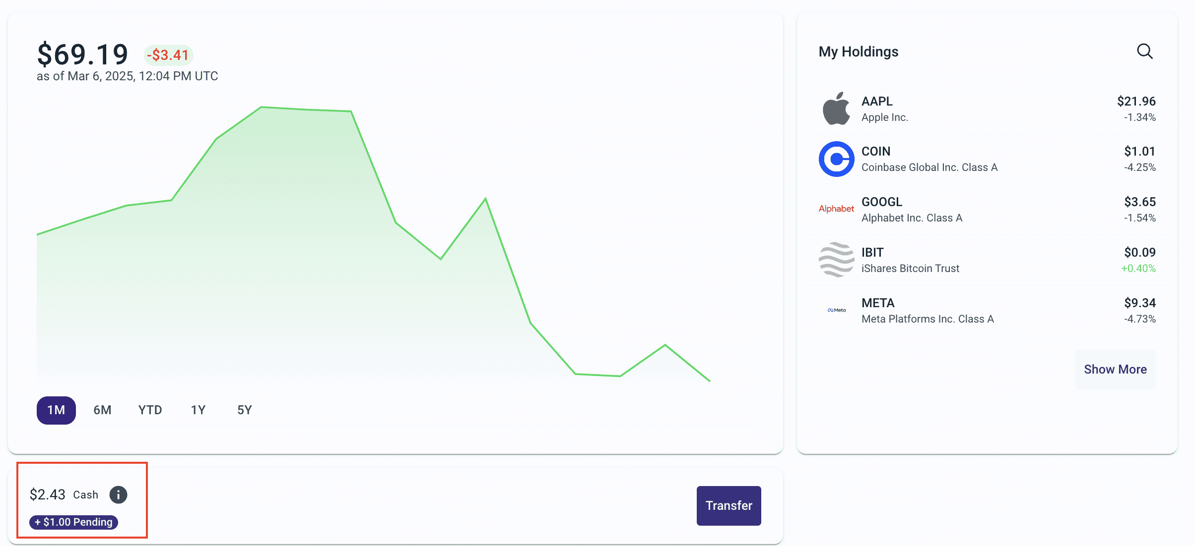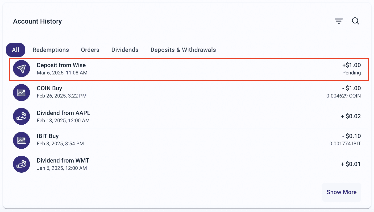 Go to the portfolio page and check the account history to see the initiated transfer, which should be pending. This guide shows a successful deposit of one dollar.