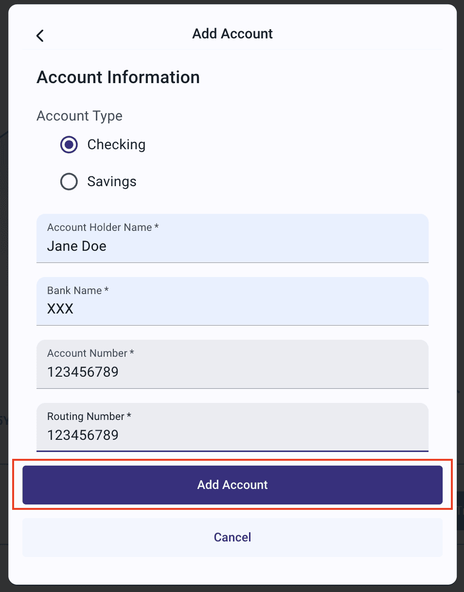 Once everything matches, click on add account. If not adding an account, press cancel. Adding an account can take from a minute to one business day, depending on the bank.